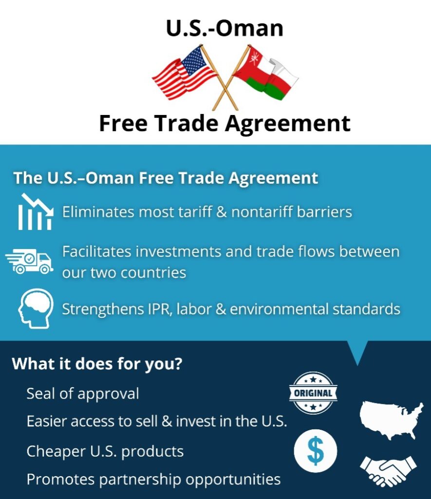 4. Integrating Sustainable Development: Embedding sustainable development and environmental protection within the FTA framework ensures equitable trade benefits. Promoting environmental standards, social responsibility, and inclusive growth creates a win-win for both nations and their citizens. This also falls in line with the 2050 Net Zero Carbon initiative by His Majesty Sultan Haitham Bin Tariq Al Said and the U.S. committing to cut total greenhouse gas emissions by at least 50% by 2030. Both part of the Paris Agreement,